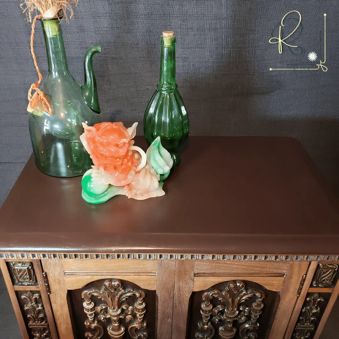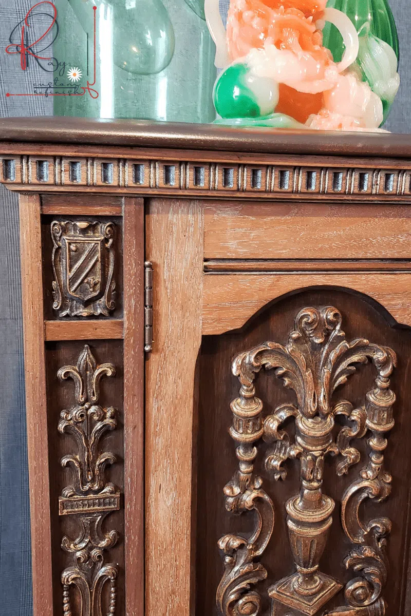 The entire piece was stripped and sanded down to bare wood, and stained with two shades of walnut wood stain creating a two-toned effect. Intricate carvings are highlighted with gold metallic wax that stands out beautifully against a dark walnut background matching the chocolate brown painted top.